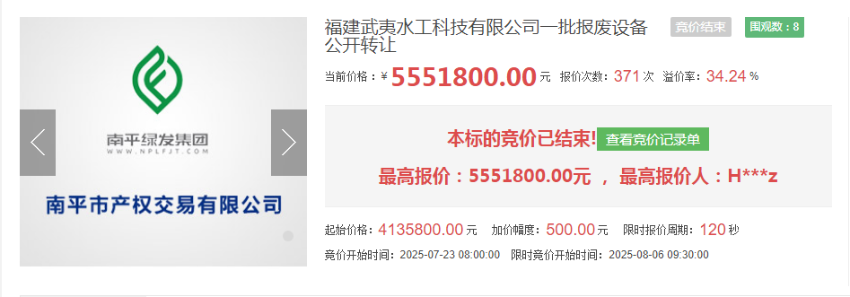 近日,福建武夷水工科技有限公司報廢設(shè)備轉(zhuǎn)讓項目在南平市產(chǎn)權(quán)交易有限公司高溢價成交,市場化運作助推資產(chǎn)增值超34%。該項目掛牌價413.58萬元,經(jīng)過多輪激烈競價,最終以555.18萬元成交,實現(xiàn)增值141.6萬元,溢價率達(dá)34.24%,實現(xiàn)閑置資產(chǎn)高效盤活與顯著增值,彰顯產(chǎn)權(quán)交易平臺資源配置效能。